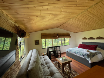 Imaginate un apartaestudio con todas las comodidades de la ciudad pero en el campo. Tendrás amplios ventanales con luz natural, panorámicas a la cordillera oriental y un espacio extremadamente acogedor para descansar, trabajar o desconectarte de la ciudad. Aquí tendrás el privilegio de tener a tu disposición todo el espacio verde que necesitas para tu salud mental y física. Podrás salir en largas caminatas o en bici, hacer fogatas, un asado, dejar a tu perro que corra libremente y mucho más. Esta casita se encuentra en un bello predio arbolizado de 18,000 m2 y cuenta con toda la independencia, privacidad y comodidades. Sus espacios te transportarán a otra realidad donde prima la naturaleza, la vida del campo, la tranquilidad y la posibilidad de disfrutar espacios únicos. Al tener un único ambiente la casita es súper acogedora, calientica y perfecta para compartir con tu pareja o estar solo unos días rodeado de naturaleza. La cama es doble, tiene un closet, tv pantalla plana smartv con netflix y directv, una cómoda barra para trabajar o comer, baño privado, calentador eléctrico y un cómodo sofa. En el exterior encontrarás una mesita con dos sillas para tomar tus comidas afuera o simplemente sentarte y disfrutar de las espectaculares zonas verdes.